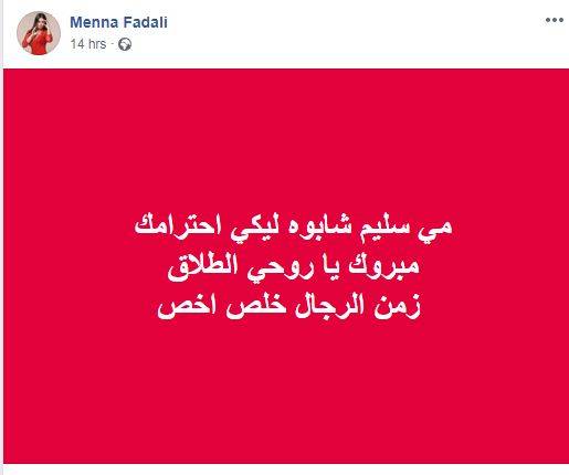 كتبت الفنانة المصرية منة فضالي لزميلتها عبر حسابها الشخصي في موقع "فايسبوك": "شابوه ليكي احترامك، مبروك يا روحي الطلاق، زمن الرجالة خلص".