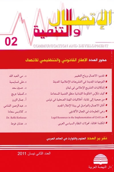 وفي العدد الثاني من المجلّة البحثية التي تُعنى بشؤون الإتصال والتنمية في المجال العربي «الإتصال والتنمية» والتي تصدر عن «دار النهضة العربية»، تُطرح إشكالية الإطار القانوني والتنظيمي للإتصال ويُعالجها من خلال مقالات مفصلّة عدد من المتخصصين في هذا المجال هم: الدكتورة مي العبدالله (رئيسة تحرير المجلّة) والدكتور علي قسايسية والدكتور حسين سعد والدكتورة كميليا جريج والأستاذ جمال الزرن والدكتور عبدالرحمن الشامي والدكتورة كلاديس سعادة والدكتور رفيق كوركوزوس والدكتور عدنان خوجة.