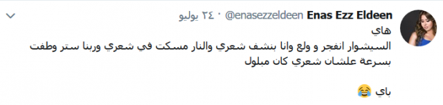وكتبت النجمة ايناس عز الدين: "هاي. السيشوار انفجر وولع وأنا بنشف شعري، والنار مسكت في شعري، وربنا ستر وطفت بسرعة علشان شعري كان مبلول".