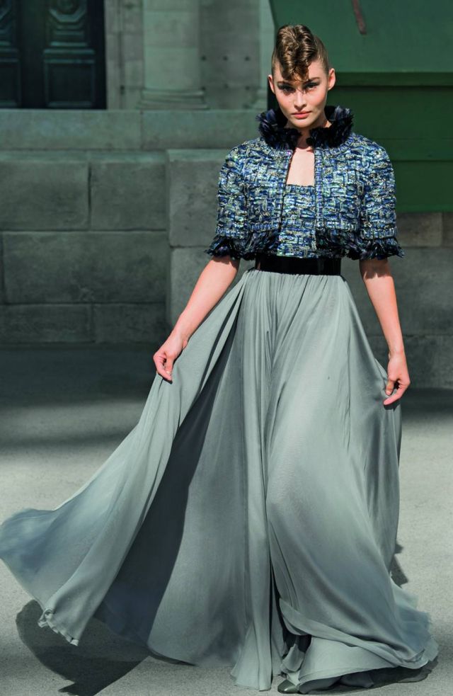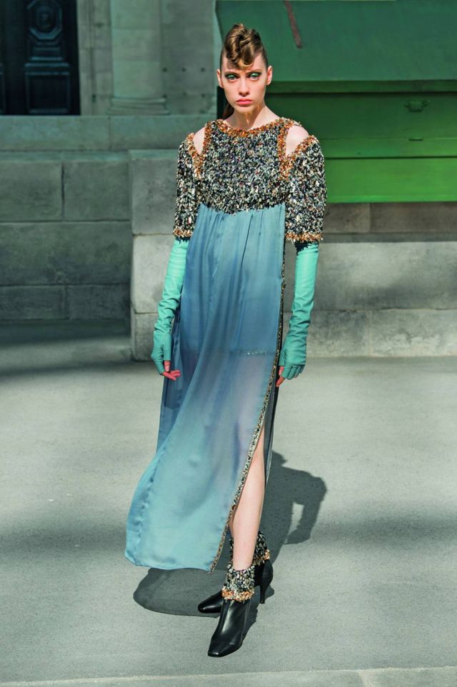 سأبدأ الحديث عن نهاية المجموعة، وتحديداً فستان الزفاف. فقد ظهرت العارضة السودانية/الأوسترالية ترتدي تايوراً أخضر بتنورة طويلة، علماً أن هذا التصميم قد لا يكون خياراً مناسباً لشابات الشرق الأوسط المعتادات على الأناقة الصافية عند شانيل. تم تحويل «الغران باليه» إلى مكان شبيه بالحدائق المحيطة بنهر السين الباريسي، وجرى تزيينه بأكشاك الكتب المألوفة في باريس.