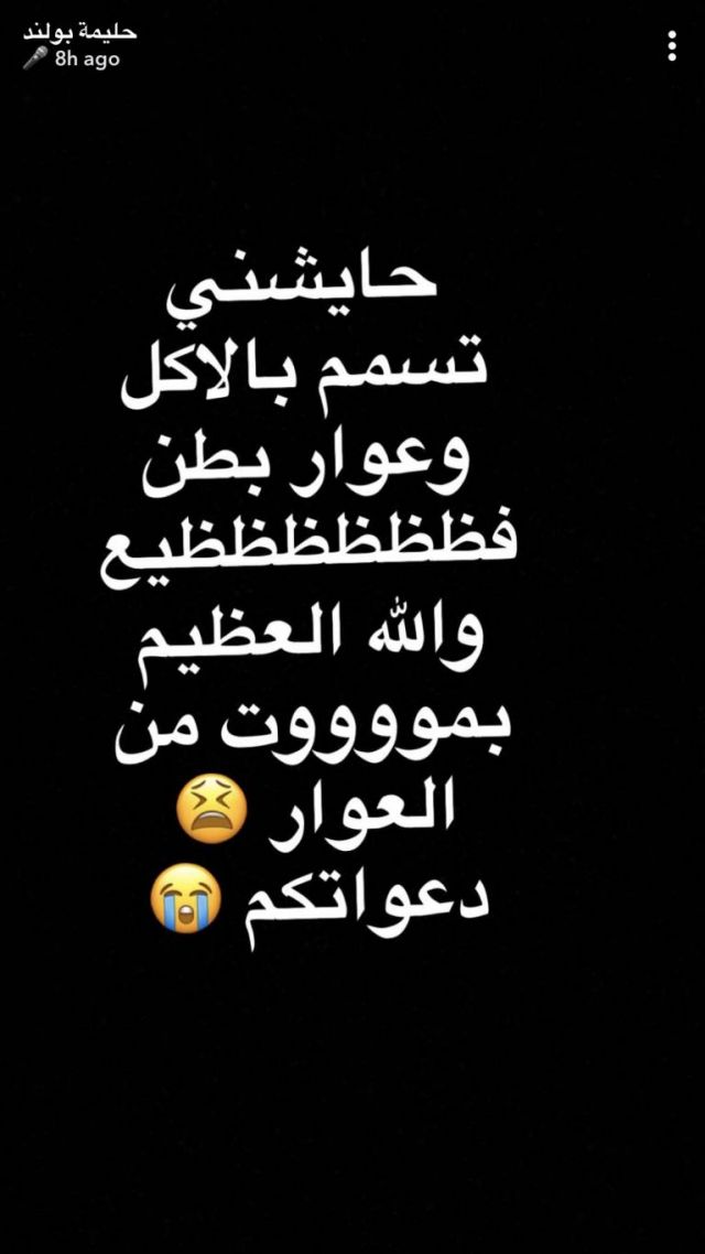 وجاء في ما نشرته: "حايشني تسمم بالأكل وعوار بطن فظيع. والله العظيم بموت من العوار".