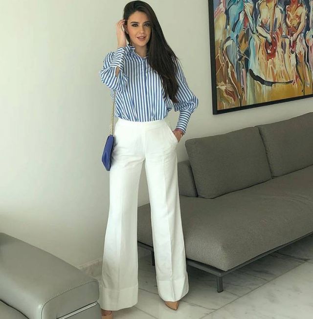 استوحي إطلالتك من الدوقة ميغان ماركل وملكة جمال لبنان بيرلا حلو، او من كيندل جينر، ونسقيه مع سروال أبيض بالقصة الواسعة من الأرجل، وأكملي إطلالتك بالكعب العالي. استوحي إطلالتك منهن وكأنك فاشينيستا خارجة من صفحات مجلّة موضة.