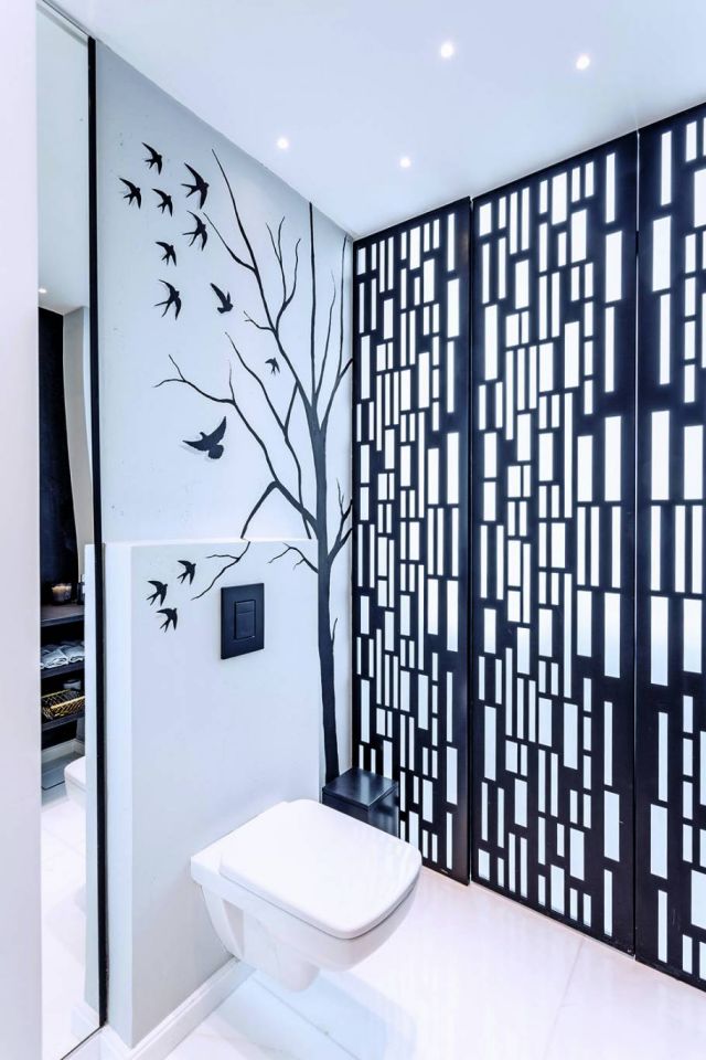 اللوحة بعناصرها الثابتة تكمل إلى غرفة النوم الماستر، بحيث ترفل الغرفة باللون الأبيض، فيما ظهر السرير مقطّع إلى مربّعات من القماش بأحجام مختلفة تخلّلتها خيوط ذهبية أكسبت الغرفة عراقة ورونقاً خاصاً. أما حمّامها فباللونين الأبيض الموشّى بالرمادي والخشب الزاهي، وحمّام الضيوف بالأبيض والأسود، رُسمت على جداره الأبيض البورسولان شجرة أغصانها باللون الداكن وحولها العصافير. الغرفة الثانية شبابية أكثر، دخلها اللون الزهر في كلمة مضاءة تعني الحلم، فوق السرير من القماش الزاهي إلى جانب التفاصيل الأخرى للخزائن والأبواب والستائر البيض.