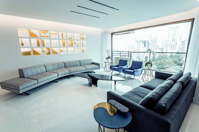 وفي ظلّ السكون التام الذي طبع الأجزاء، سُلّط الضوء أكثر على الأثاث الفخم من ماركات ايطالية فاخرة، وعلى الطاولات التي توزّعت بتصميمها اللافت بين الجلسات. وبرزت بعض الأكسسوارات الذهبية على جدار غرفة الطعام مثلاً، فتوزعت مجموعة من القطع المستديرة على الجدار وداخل فجوة مستطيلة في جدار الصالون، مربّعات من الجفصين في داخلها رسوم ذهبية شكّلت لوحة متكاملة ممتعة للنظر لما فيها من إبداع هندسي. واستلقى أمام هذا الجدار مقعد شبه مستدير من الجلد الرمادي الفائق العصرية، يقابله مقعد من القماش بلون رمادي أكثر دكنةً. وأمام الزجاج، مقعدان أزرقان منفصلان وإلى جانبهما طاولتان من الحديد بشكل هندسي لافت. وفي الوسط، طاولة مقسّمة إلى ثلاثة أجزاء تشكّل مجتمعة تحفة رائعة من الذوق والتفنّن. ورغم انفتاح المساحة على بعضها، استطاعت المهندسة خليل أن تعطي لكلٍ منها استقلالية تامة، بحيث توزّعت الصالونات بتجانس أكسب كلاً منها خصوصية لتشكّل كلّ جلسة مساحة بذاتها.