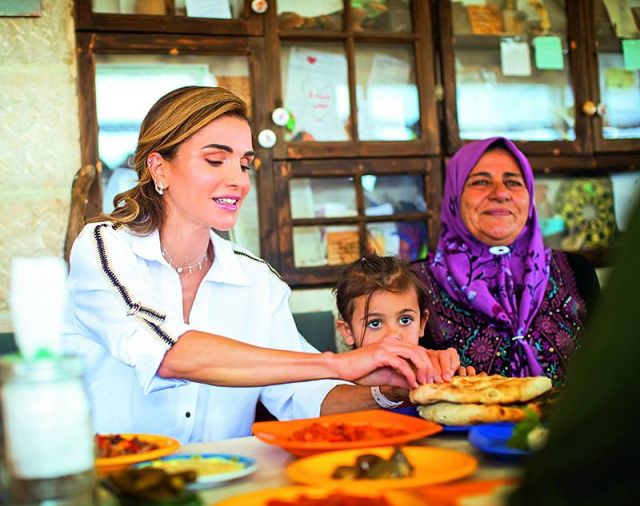 التقت الملكة رانيا العبدالله مجموعة من السيدات الناشطات في محافظة عجلون، وذلك خلال زيارة الى مقهى سماقة في مركز زوار قلعة عجلون الذي تديره "جمعية الكفاح التعاونية" التي تأسّست عام 2004.