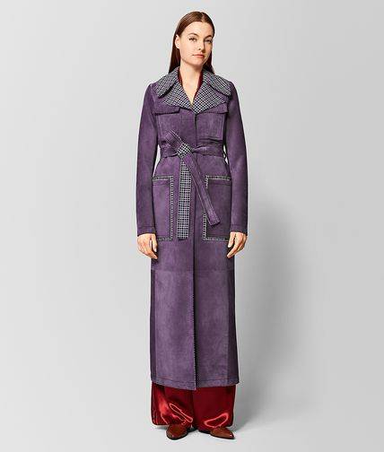 ونسقت تحته قميصاً باللون البنفسجي، مُزيناً بعقدة كبيرة عند العُنق. وأكملت إطلالتها بمعطف طويل من جلد الغزال باللون البنفسجي، مبطن من الداخل بنقشة الكاروهات ويبلغ ثمنه نحو 12,700 دولار أميركي، من علامة Bottega Veneta.