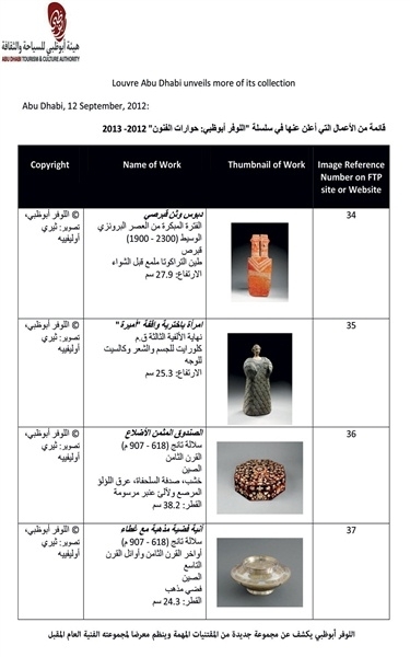 أعلن متحف اللوفر أبو ظبي اعتزامه عرض مجموعة من المقتنيات المهمة التي تشكل جزءاً من المجموعة الدائمة التي ستقدم خلال الدورة الثانية من سلسلة «اللوفر أبو ظبي: حوارات الفنون» التي تقام من 3 تشرين الأول/أكتوبر 2012 إلى 26 حزيران/يونيو 2013.