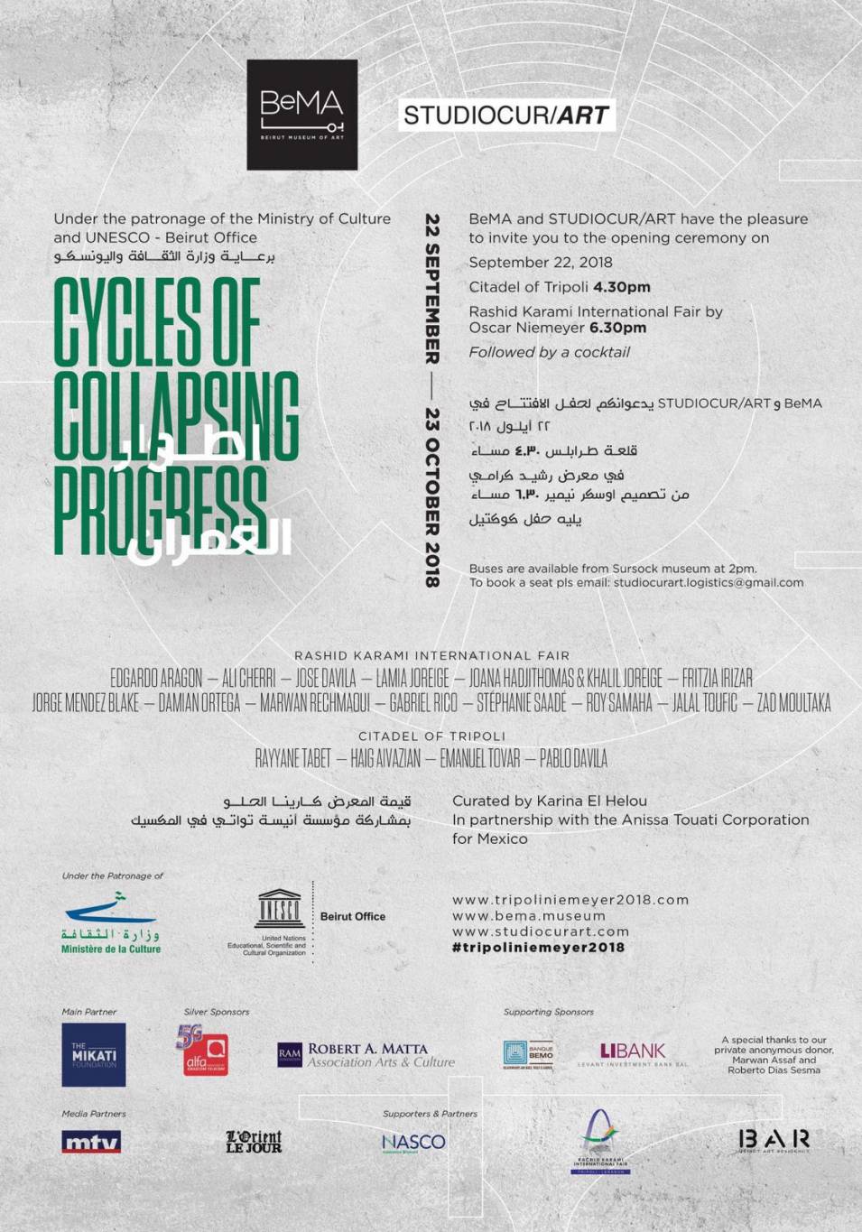 تحت رعاية وزارة الثقافة اللبنانية ومكتب منظمة اليونيسكو في بيروت، يفتتح كل من "بيروت متحف الفن (BeMA) ومنصة STUDIOCUR/ART، معرض الفنّ المعاصر "أطوار العمران" (Cycles of Collapsing Progress)، في قلعة طرابلس ومعرض رشيد كرامي الدولي بالتوازي، يوم غد السبت، الرابعة والنصف بعد الظهر.