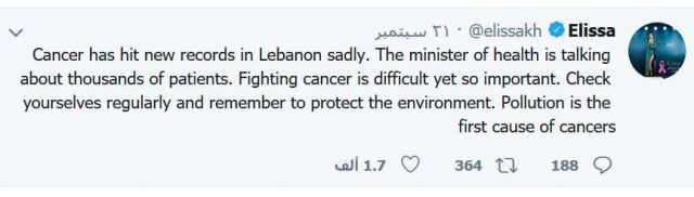 ومن أبرز هؤلاء الفنانة إليسا، التي عبرت عن حزنها الشديد بسبب ذلك. فقد نشرت على حسابها على "تويتر" تغريدة كتبت فيها: "سجل السرطان رقماً قياسياً جديداً في لبنان، للأسف. وقد تحدث وزير الصحة عن آلاف المرضى".
