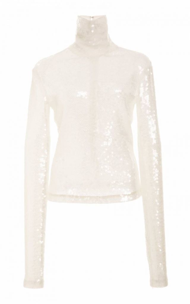 واختارت كنزة من الترتر اللماع ذات ياقة عالية وأكمام طويلة، يبلغ ثمنها نحو 1,250 دولاراً أميركياً، مع تنورة مستقيمة من القماش ذاته، يبلغ ثمنها نحو 1,550 دولاراً أميركياً.