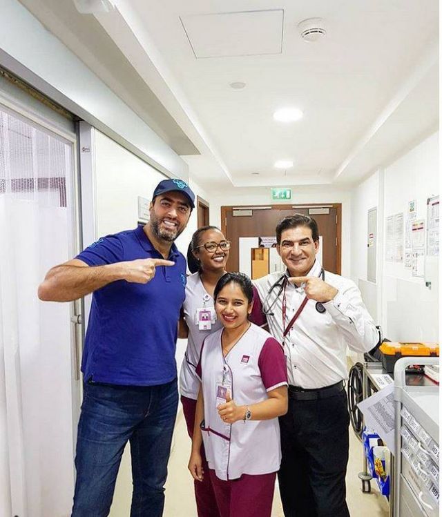 وظهر في الصورة إلى جانب الطاقم الطبي. وفاجأ الجميع بمرضه وكتب: "كل الشكر للكادر الطبي الرائع وعلى رأسه الدكتور يحيى كيوان الراقي والبارع في عمله على الرعاية الرائعة التي أحاطوني بها خلال الوعكة الصحية التي مررت بها مؤخراً والشكر موصول لمشفى ميدكير دبي الأكثر من مميز. من القلب شكراً".