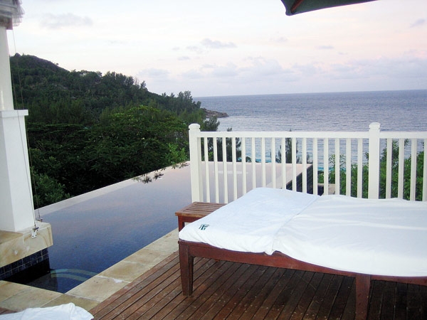 وهناك الفيلا الرئاسية والفيلات التي تتألف من غرفتي نوم. كانت شيلا فخورة بعملها في هذا الفندق. ولمَ لا ! تخيل نفسك موظفًا في فردوس أرضي حيث كل شيء ترف وأقرب إلى الكمال. بعد جولة التعرّف إلى الفندق وزّعت علينا شيلا مفاتيح فيلاتنا. كانت الفيلا التي مكثت فيها في أعلى القمة وحوض السباحة فيها بدا امتدادًا للمحيط. إنه خداع البصر. جلست أتأمل المحيط الأزرق الذي لا نهاية له، وفي وسط تأملي اخترق السكون تغريد سرب طيور هي «سكان» المكان الذين شعرت بأنهم يخبرون بعضهم عن الغريبة التي تسكن منطقتهم، فحدث حوار موسيقي أقرب إلى السمفونية.