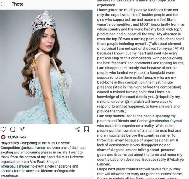 وتابعت أن وصولهم المتأخر، قبل ليلة من موعد الانتخاب، أربكها. وتابعت: "أتمنى أن تجد مديرتي ريما فقيه ما تقوله لتوضيح ما حدث ولتقديم الإجابات لي لأعرف الحقيقة"، إلا أن هذا عرضها لجملة من الانتقادات حيث اعتبر بعض المتابعين أنها لا تتمتع بروح رياضية ولا تتقبل الخسارة وأنها ناكرة للجميل.