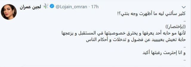 وجاء ردها على أسئلتهم من خلال تغريدة نشرتها على حسابها على "تويتر". فقد كتبت: "كثير سألني ليه ما أظهرت وجه بنتي".