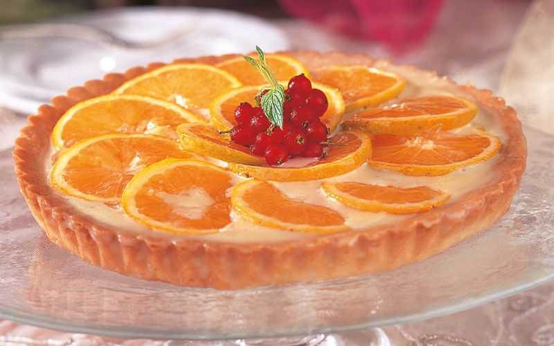 يسكب مزيج البرتقال البارد فوق التورتة وتوزع فوقه شرائح البرتقال على نحو متشابك. تحفظ التورتة في قسم التجليد من الثلاجة طوال الليل.