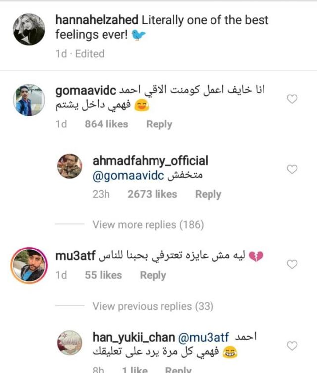 وردّ فهمي على أحد المعلقين الذي عبّر عن خوفه من شتائم فهمي الذي يخسر حبيبته الكثير من محبيها وجمهورها بسبب عصبيته وردّ فعله غير المحسوب، وكتب له آخر تعليقاته على الصفحة "متخفش"، في إشارة واضحة منه انه لن يتدخل بعد الآن ولن يشتم متابعي الزاهد.