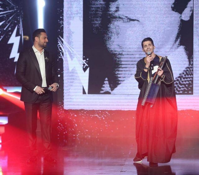 فقد توجه إلى المسرح لأداء أغنية "دقي دقي يا ربابة" حاملاً هذه الآلة ومرتدياً عباءة تقليدية.