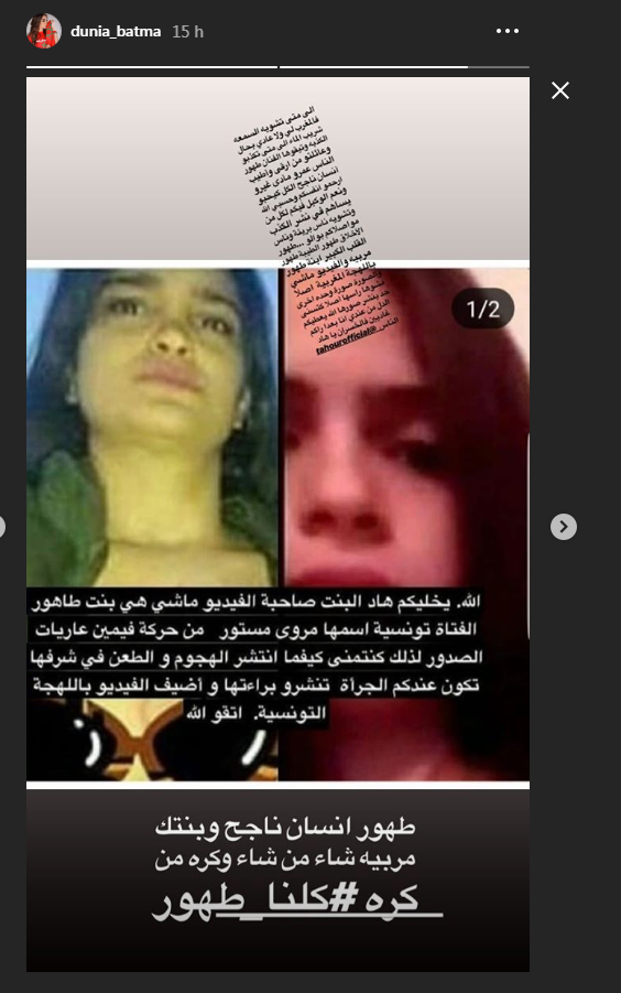 وأضافت: "لذلك كنتمنى كيفما انتشر الهجوم والطعن في شرفها تكون عندكم الجرأة تنشروا براءتها وأضيف الفيديو باللهجة التونسية. اتقول الله".