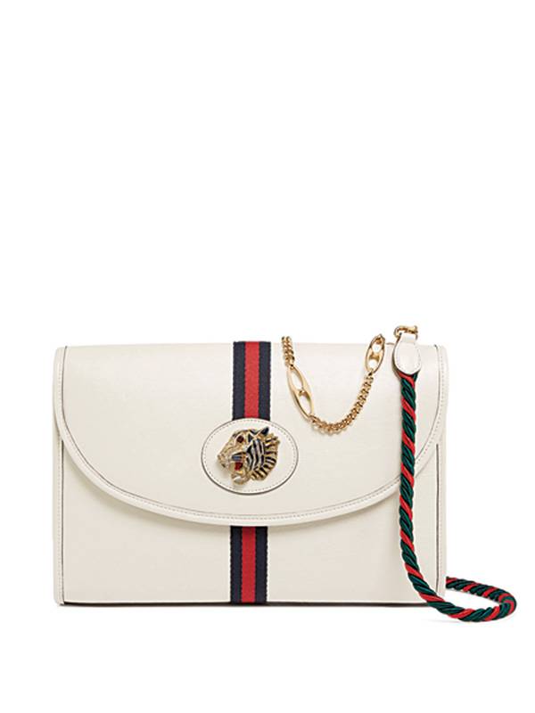 تكتمل مجموعة «راجا» Rajah مع حقيبة الكتف جديدة على شكل ظرف في حجمين مختلفين (المتوسطة والصغيرة). هذا التصميم الجديد الجذاب يترجم رموز «راجا» بطريقة أكثر عملية. وتأتي بحزامين للكتف، حزام قابل للفصل بالألوان الشهيرة، وحزام من سلسلة ذهبية ثابتة مع تفاصيل كالسلسلة البحرية. تأتي النسخة الجلدية من هذا الطراز باللون الأسود والأبيض والأحمر، في حين تأتي بنسخة مخملية من GG بلون بني مخملي. لإضفاء مظهر فنتاج VINTAGE. تتوافر حقيبة الكتف هذه أيضاً بقماش ميني GG Supreme، وهو نمط من أرشيف الدار في أواخر السبعينيات. وتم مزجها مع شريط خفيف لإضفاء مظهر مميز. هذه الحقيبة هي القطعة التي لا بدّ من اقتنائها هذا الموسم.