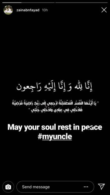 كشفت زينب فياض، إبنة الفنانة اللبنانية هيفاء وهبي، وفاة أحد الأشخاص المقرّبين منها. ونشرت، عبر خاصية "ستوري" على حسابها على "إنستغرام"، منشوراً تمنت من خلاله الرحمة لعمها.