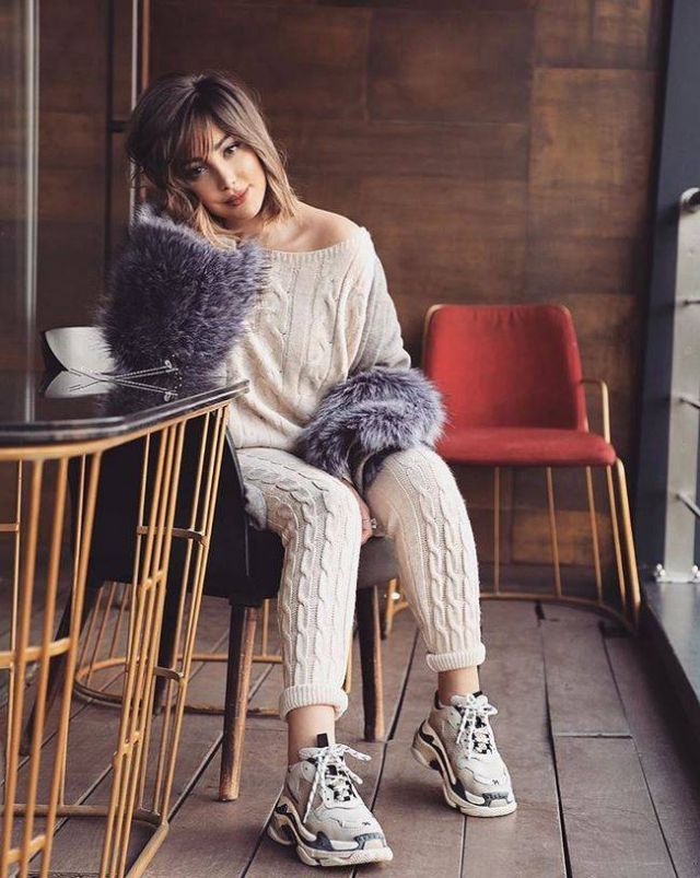 فقد ظهرت فيها وهي تجلس مرتدية طقماً من الصوف بلون الـ"أوف وايت". وتميز بكنزة مع أكمام أمامية من الفرو كما أضافت إليه حذاءً رياضياً.