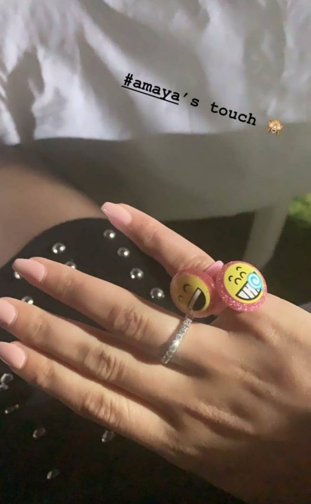 وفي الايام الماضية، نشرت بوسيل صورة ليدها وهي تضع خاتم الزفاف الماسي والى جانبه خاتمين من البلاستيك كل اشكال وجوه ضاحكة وعلقت غليها قائلة "لمسات امايا".