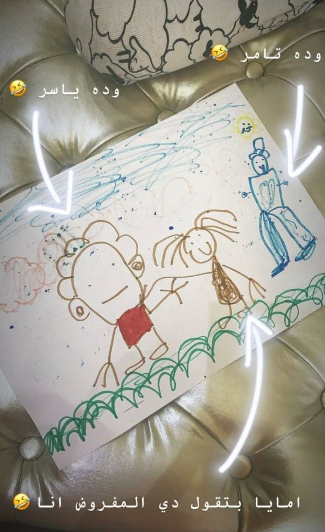 وشاركت زوجة الفنان تامر حسني متابعيها عبر خاصية الستوريز بصورة طريفة قامت برسمها ابنتها امايا، حيث رسمت بعض الاشخاص وشبهت اشكالهم بأشكال باقي افراد عائلتها، فظهر تامر في الصور كالرجل الالي مع رسم قلب على سترته. بينما رسمت والدتها بشكل غريب، فما كان على الاخيرة ان ابدت فرحتها من رسمة طفلتها.