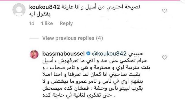وكتبت المتابعة: "نصيحتي احترسي من أسيل وأنا عارفة بقول إيه". ما دفع المصممة إلى الردّ حيث كتبت: "حبيبتي حرام تحكمي على حد وانت ما تعرفيهوش. أسيل بنت متربية أوي ومحترمة وهي وتامر صحاب وبقيت صاحبتي أنا كمان لما تعرفنا".