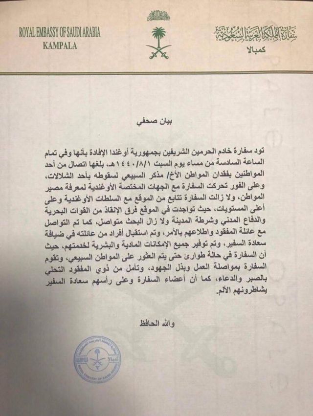 كما ذكرت السفارة السعودية في أوغندا أنها قامت بالتواصل مع أسرة المفقود وأطلعتهم على الأمر، وتم استقبال عدد من أفراد عائلته، وتوفير الإمكانيات المادية والبشرية لخدمتهم.