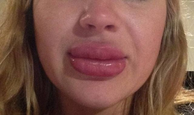 فبعدما أزالت الكوب نظرت إلى وجهها في المرآة وأصيبت بحالة من الهلع. وتبيّن أن شفتيها لم تصبحا ممتلئتين بل متورمتين ومشوهتين ومؤلمتين.