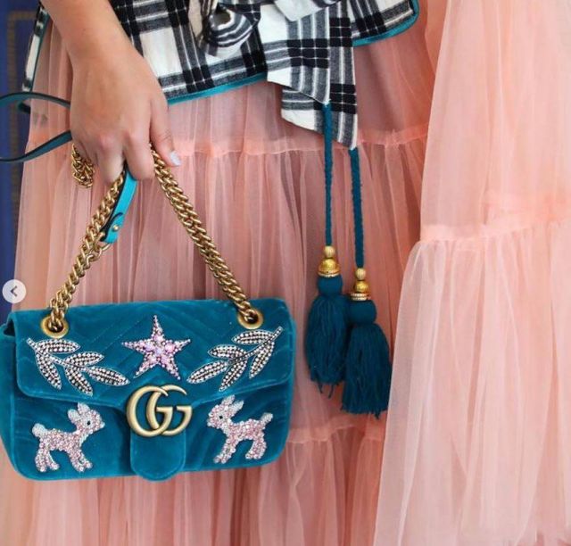 كما حملت حقيبة باللون الأزرق المناسب لبعض تفاصيل القميص مع نقشات رسوم براقة.