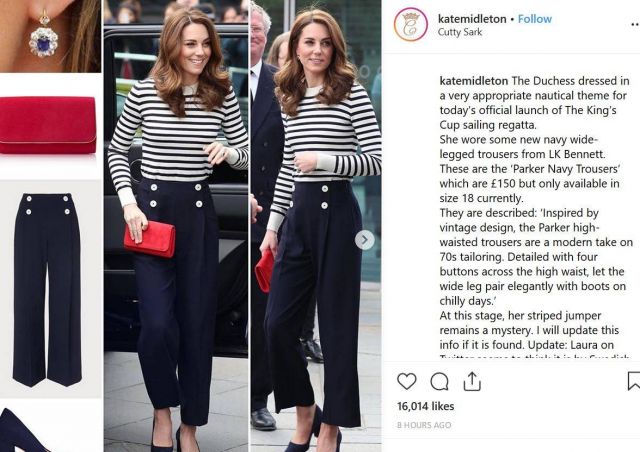 وظهرت بأسلوب كلاسيكي إذ اختارت كنزة يقترب ثمنها من 85 دولاراً مع سروال مناسب بسعر 196 دولاراً، من علامة LKBennet المفضلة لديها.