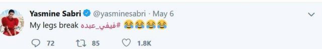 وغردت قبل ذلك: "My Legs Break، فيفي عبده" مع رموز الوجه الضاحك، مشيرة بذلك إلى قول الأخيرة أثناء البرنامج إن رجلها كسرت.