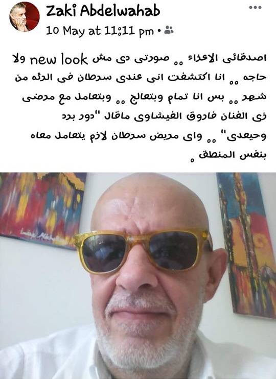 وعلق على الصورة التي انتشرت بشكل واسع قائلاً: "أصدقائي الأعزاء دي صورتي، دي مش نيولوك ولا حاجة، أنا اكتشفت إني عندي سرطان بالرئة من شهر بس، أنا تمام وبتعالج".