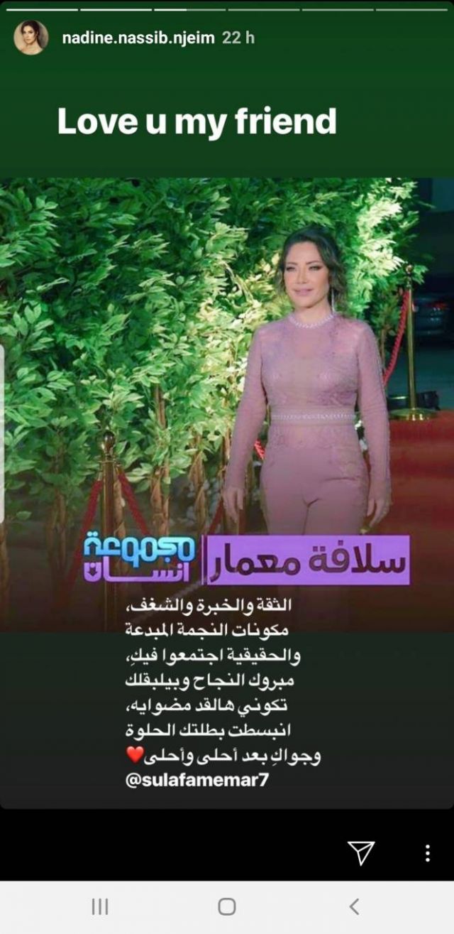 نشرت الفنانة اللبنانية نادين نسيب نجيم، عبر خاصية "ستوريز" على حسابها على "إنستغرام"، صورة للفنانة السورية سلافة معمار مع التعليق: "الثقة والخبرة والشغف مكونات النجمة المبدعة والحقيقية اجتمعوا فيك. مبروك النجاح وبيلبقلك تكوني هالقد مضواية. انبسطت بطلتك وجواك بعد أحلى وأحلى. أحبك صديقتي".