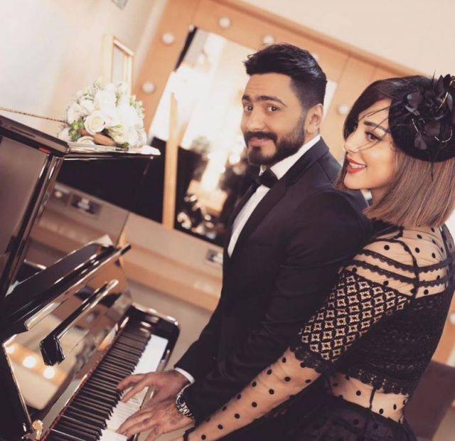 وظهرت في إحدى الصور إلى جانب زوجها الفنان المصري تامر حسني وهما يضعان أصابعهما على لوحة مفاتيح البيانو.