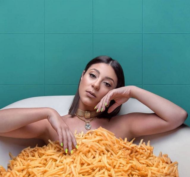 ونشرت الصورة على حسابها على "إنستغرام" وظهرت فيها وهي تجلس عارية في حوض الاستحمام مغطاة بشرائح البطاطا المقلية.