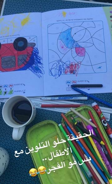 اما الصورة الثانية، فكانت لدفتر عليه رسومات ومجموعة من اقلام التلوين، وعلق عليها: "للحقيقة التلوين مع الاطفال حلو بس مش الفجر"، واضاف عليهما ايموجي لوجوه ضاحكة.