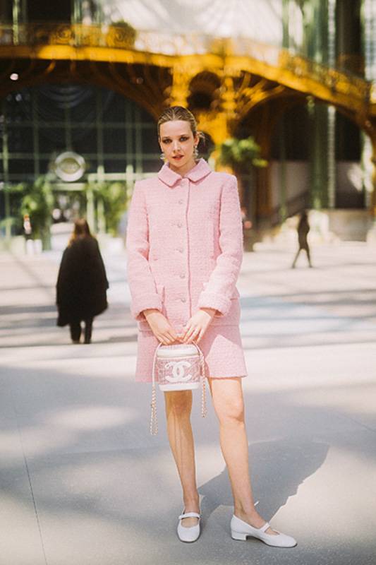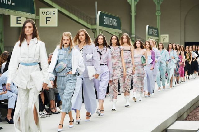 هذا الموسم، دعت دار شانيل ضيوفها للانطلاق في رحلة خيالية. تحوّل الغران باليه في باريس إلى محطة قطار باريسية بأسلوب الـ Beaux-Arts، بالترافق مع مقهى Le Riviera الأنيق. أرادت فيرجيني يارد من خلال هذا الديكور الجميل أن تكتب حكاية سفر لم يمسّها الزمن فيما أطلقت صفارة القطار معلنة الانطلاق في رحلة مرحة ومشمسة. بالإضافة إلى الأسود والعاجي والأبيض، برزت ألوان الوردي، والأخضر، والأزرق، والفوشيا والبنفسجي، بالترافق مع الأصفر الزعفراني والبني والكحلي وأزرق الكوبالت. امتزجت ظلال الباستيل مع بعضها البعض، فيما تداخلت نقوش الأوراق فوق خلفية زرقاء أو فوشيا فبدا المشهد مثل منظر طبيعي مموّه بفعل سرعة القطار. برز الترتر الوردي والأزرق، وتطريزات الأزهار المزينة بالترتر أو المقصوصة من الحرير والتول، فبدت التصاميم مثل حديقة تتوسطها براعم الكاميليا.