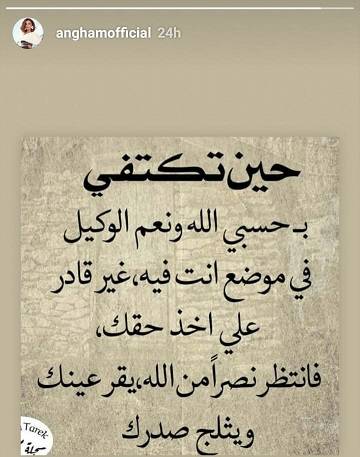 ورغم محاولتها البقاء على الحياد وعدم الرد، ولكن يبدو انها قررت استخدام المنشور ليكون رسالة واضحة لكل منتقديها، وكتب في الصورة: "حين تكتفي بحسبي الله ونعم الوكيل في موضع أنت فيه غير قادر على أخذ حقك، فانتظر نصرا من الله يقر عينك ويثلج صدرك".