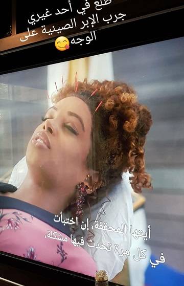 ونشزت لجين عبر خاصية الستوريز على تطبيق انستغرام صورة لاحدى السيدات اللواتي اتبعن التقنية نفسها لعلاج البشرة والتي تقوم على الاستلقاء على الظهر ويغرز في كل مساحة وجهها عدد من الإبر الصينية.