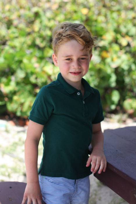ويظهر الأمير جورج الذي يحتل المرتبة الثالثة في العرش في الصور وهو يرتدي قميص منتخب انكلترا لكرة القدم، ويظهر ابتسامة كبيرة في حديقة منزلهم قصر كينسغتون بوسط لندن.