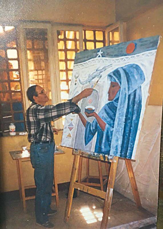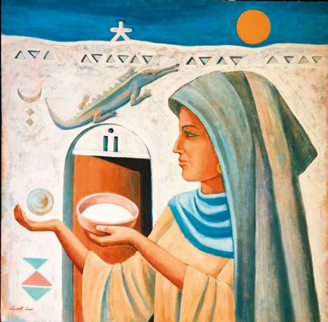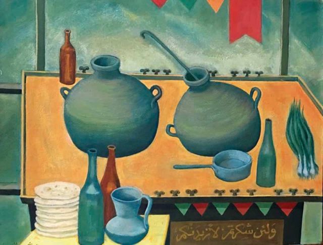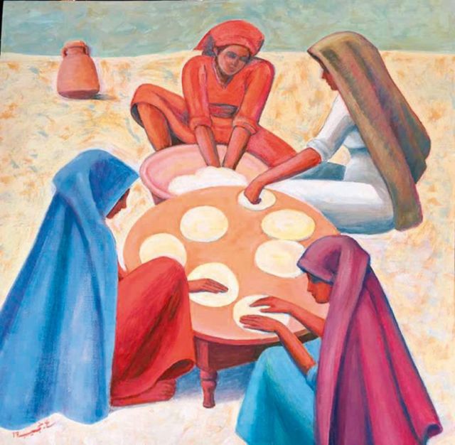 بالفعل، في هذا المعرض يعودُ الإنسان بملامحِه الماديّة إلى غالبية اللوحاتِ، بعد أن غابتْ عن معارضي السابقة – إلا قليلاً– حتى الثمانينات، كنت خلالها أستعيضُ عن هذه الملامح باستشعار أنفاس هذا الإنسان وهمساته بين الصخور والجدران، أشعرُ اليومَ بحنينٍ قويّ إلى أن تلمسَ فرشاتي هذه الملامح الإنسانيّة، وإلى استدعاءِ صورٍ واقعيةِ عايشتها في الماضي البعيد، فأستعيدُ معها رحيقَ العيشِ في أماكنَ منسيةٍ في القرى والواحات والصحارى، طالما بحثتُ فيها عن عبقرية المكان. اليومَ أحاول فتح الصناديق المطوية لحياة الناس بهموم عيشهم وأحلامهم الصغيرة، فأراهم بعين الحلم والخيال، عبر ثقافتهم الممتدّة ورموزهم السحرية، وأحلّقُ معهم نحو واقعيةٍ بلا ضفافٍ، بعيداً عن صفة الرجعيّة وعدم مسايرة الحداثة والتقدّم. فهاتان الكلمتان تحملان قيماً إنسانيةً تتجاوزُ الأشكال والأساليب إلى جوهر المعاني الكليّة في تعاملها مع الإنسان والعصر، ومن دون هذا التفاعل تظلّ أشكالاً جوفاءَ معزولةً عن الناس منقطعةً عن الواقع والحياةِ، إلا من خلال المتاحف وقاعات النخبة وبطون الكتب. هذه القناعةُ هي ما يعصمني من فقدان الثقة بالنفس في واقع مغترب ثقافياً، وهو ما يحفظُ لي توازني في خضمّ تياراتِ الاغتراب، وفي زمن الاهتزاز القيميّ "العظيمِ" في الفن والحياة.