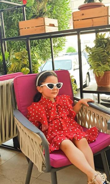 ولفتت الطفلة الانظار بفستان قصير بقماش ناعم باللون الاحمر ونقتط كبيرة بيضاء ونسقت معه حذاء طفولي انيق ووضعت نظارات بيضاء مع قلادة من اللؤلؤ كالصبايا.