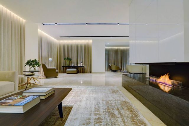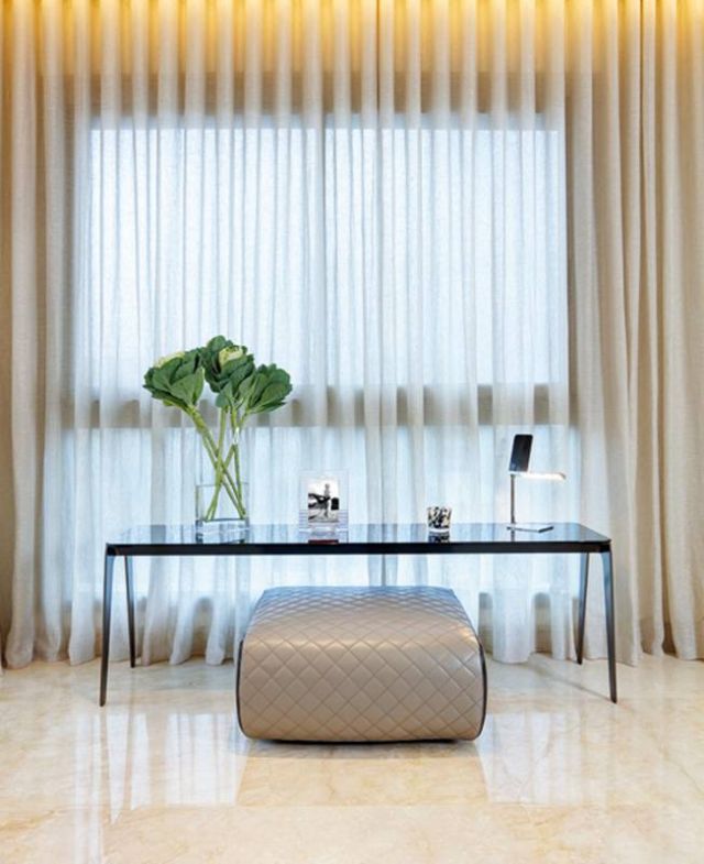 هذه الشقّة في قلب بيروت النابض فسيحة ومتلألئة بحلّة بيضاء أنيقة. أينما وقع نظرنا نرى الأجزاء المتماسكة من حيث المواد المستخدمة والأشكال الهندسية وطراز الأثاث العصري. وعادةً ما يعمد المهندس وهبة الى استخدام الأثاث كلّه من شركة واحدة عالمية معروفة بصناعة المفروشات، وبذلك يحافظ على النمط الهندسي الموحّد: طراز عصري بقماش فاخر وألوان ونقوش متناسقة، وكذلك الأكسسوار والطاولات ذات التصاميم المبتكرة بمواد ممزوجة بفنّ، اختارها مع المالكين من مدينة ميلانو الإيطالية. ونزولاً عند رغبتهم، أبقى المساحة واحدة لا تفصل بينها الحواجز، مع المحافظة على هويّة كلّ ركن.