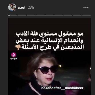 بدورها، نشرت عمران المقطع عبر خاصية الستوريز على تطبيق انستغرام وكتبت عليه "مو معقول مستوى قلة الادب وانعدام الانسانية عند بعض المذيعين في طرح الاسئلة".