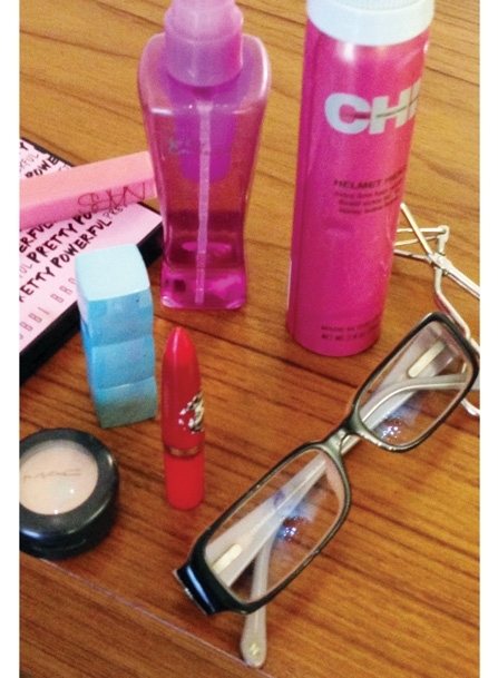أحمر الشفاه المفضّل غلوس من Nars بلون Turkish Delight، خافي العيوب من M.A.C.، وأحمر شفاه من Rain Cosmetics، عاقص للرموش من M.A.C.، وأيضاً مسبحة من أخي رامي.