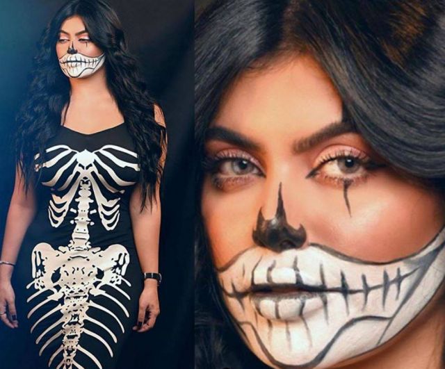 وظهرت فيها مرتدية فستاناً أسود رسم عليها هيكل عظمي باللون الأبيض. ولم تكتف بهذا بل أضافت إلى وجهها رسماً مخيفاً.