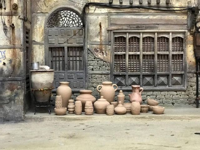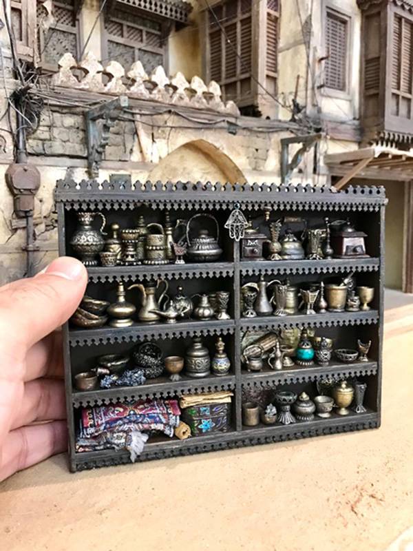كل الأواني المستخدمة آنذاك كانت صغيرة الحجم، لتتناسب مع حجم المجسم، لأن المقياس 1/18 صغير جداً، ربما دلّة القهوة لا يتجاوز ارتفاعها 1 سم، وهناك فناجين القهوة والسيوف والخناجر والسماور والمصابيح والفخاريات، وكل ما توافر في تلك الحقبة.