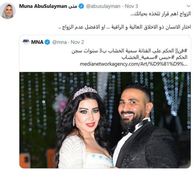 ونشرت لذلك صورة لهما مرفقة إياه بخبر الحكم بحبس الخشاب لمدة 3 سنوات. وغردت بدورها: "الزواج أهم قرار تتخذه بحياتك. اختر الإنسان ذو الأخلاق العالية والراقية أو الأفضل عدم الزواج".